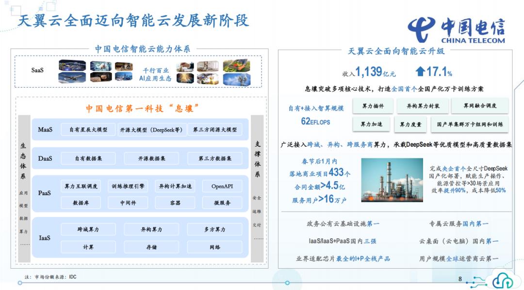 3月25日,中国电信召开2024年度全年业绩发布会上,中国电信管理层介绍了天翼云相关情况。财报显示,2024年,天翼云收入达到1139亿元,同比增长17.1%。 ![]() 值得关注的是,2023年天翼云的营收为972亿元,同比增长67.9%,相较2023年,2024年天翼云增速明显放缓。 在此次发布会上,有媒体提问,天翼云增速放缓的原因是什么? 对此,中国电信董事长柯瑞文表示,天翼云经过多年的发展,2023年实现接近千亿收入,基本实现了既定的目标。2024年,在这样庞大的基础上,公司实现了17%的增长。这一增长符合云计算行业的普遍规律,通常在通算时代,行业增幅大致为低两位数。天翼云的这一增长水平在预期范围之内,也与云计算行业发展趋势和特点相符。 此外,天翼云还进行了结构调整,把握了机会,从通算转向智能计算与智算发展,特别从天翼云转型为智能云。去年,智算领域的增长表现非常强劲,智慧计算的收入增长也较高,这反映了云计算向智能云演进的趋势,只有在这一转型过程中,云计算才能保持持续增长。 在算力方面,随着DeepSeek的提升,算力的利用率也得到了显著提高。今年,算力依然是公司的重点发展方向,预计会保持良好的增长态势。公司对市场充满信心,始终坚持解决客户实际问题,而不仅仅是提供算力服务。 柯瑞文还强调,客户购买的不仅仅是算力,而是能够跟得上新一代信息技术和人工智能发展的解决方案,只有持续运营和安全管理才能确保长期的可持续发展。 另外,柯瑞文提出,智能云服务的目标是解决实际问题,而不仅仅是提供算力。公司通过这样一个开放平台,能够高效整合异构算力和多方算力,提高资源的利用率,推动智能化水平的提升。这个平台为云计算的持续增长提供了重要支持。 关于智算能力的提升,柯瑞文表示,当前的重点是推理算力,尤其是面向客户边缘或端侧的推理计算。公司根据市场需求不断进行调整,确保能够灵活应对并满足客户需求,同时也做好了充足的技术储备,市场可放心,天翼云具备足够的能力满足未来需求。 ![]() 年报显示,2024年天翼云全面升级为智能云,取得了一系列突破性进展:政务公有云基础设施排名国内第一,专属云服务位居国内第一,云桌面(云电脑)国内第一,用户规模全球运营商云第一,IaaS/IaaS+PaaS排名国内三强,并且拥有业界适配芯片最全的I+P全栈产品。 天翼云广泛接入跨域、异构、跨服务商算力,承载了DeepSeek等优质模型和高质量数据集。 春节后的一个月内,天翼云落地商业项目超433个,合同金额超过4.5亿元,服务用户超过16万户。同时,成功完成央企首个全尺寸DeepSeek国产化部署,赋能生产操作、能源管控等超过30个场景应用,效率提升90%,成本降低50%。 整理:李洪力 编辑:洪力 指导:辛文 一组数字:看复杂市场中的中移动平衡术 坐稳万亿俱乐部:中国移动2024业绩出炉(附PPT) “稳步”和“良好”:杨杰谈中移动2025增长预期 大象如何“稳跑”:杨杰详解中国移动2025增长预期 1112.04亿元,中国移动2024年应收账款激增41.6% 成绩单:一张图看中国移动2024年业绩 中国联通2024业绩出炉:三个向新成绩斐然(附PPT) 举例说明:陈忠岳详解中国联通“融合创新”战略 在AI大时代“有力增长”:中国联通这场Q&A信息量巨大 喜人:一张图看中国联通2024年业绩 超8600亿!华为2024年营收强劲增长22% 中国铁塔2024年报:收入利润双增长 净利润飙升!腾讯“最牛”财报发布 爱立信2024财报:利润增长36% AI向实:中兴通讯2024年业绩出炉 亚信科技2024财报:数智运营企稳回升 中信国际电讯2024财报:收入利润发布 ![]() |