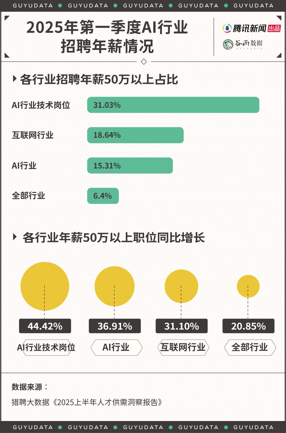 猎聘大数据表现,AI 行业技能岗位中,超三成年薪在 50 万元以上,占比是互联网行业(18.64%)的两倍左右,更是全行业均匀程度(6.4%)的近 5 倍。别的,AI 技能岗高薪职位的比例增速也是最快的,本年上半年同比增长近五成。