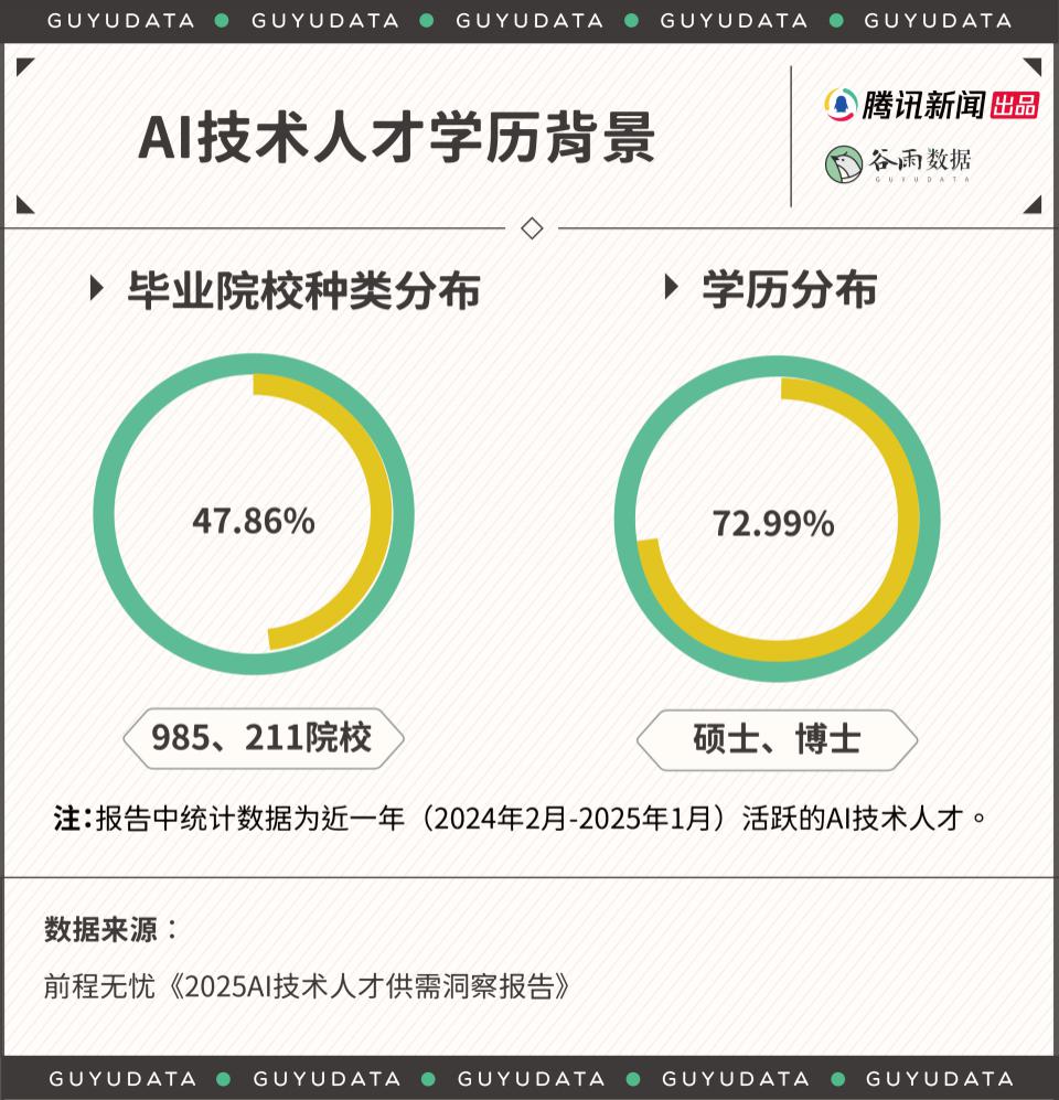 AI 行业技能岗的门槛极高。凌驾 7 成从业者拥有硕博学历,近一半都结业于 985、211 名校。
