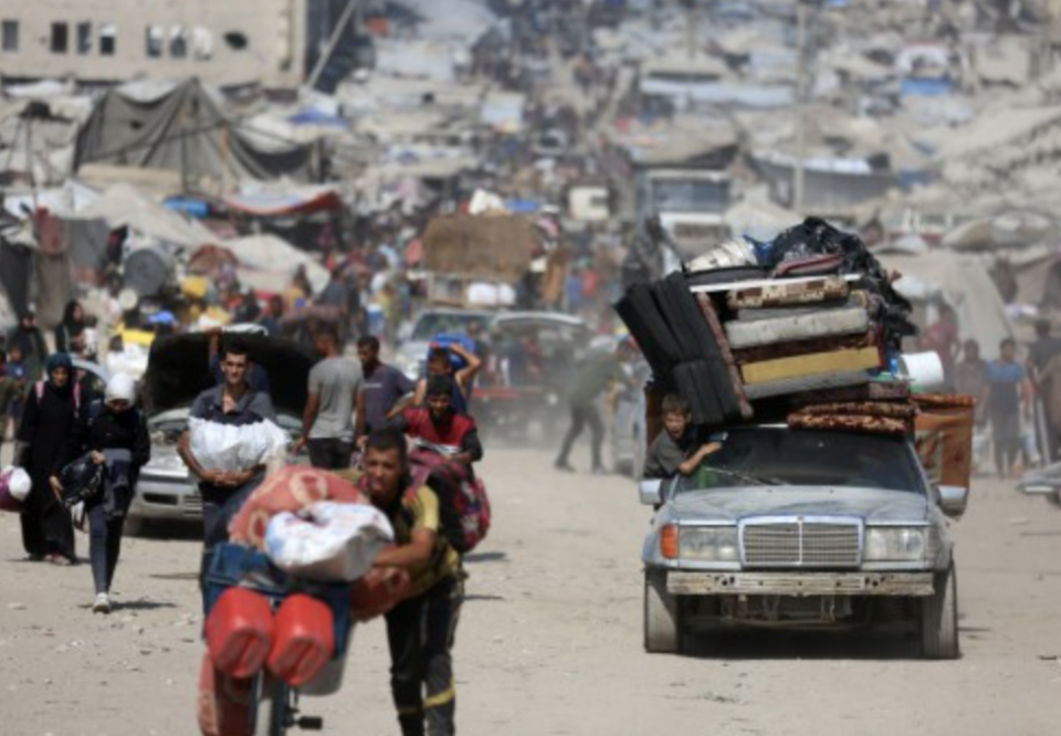 ▲9月18日,在加沙城以西的沿海公路上,人们运载着生存用品,汇入人潮向南撤离。图据新华社